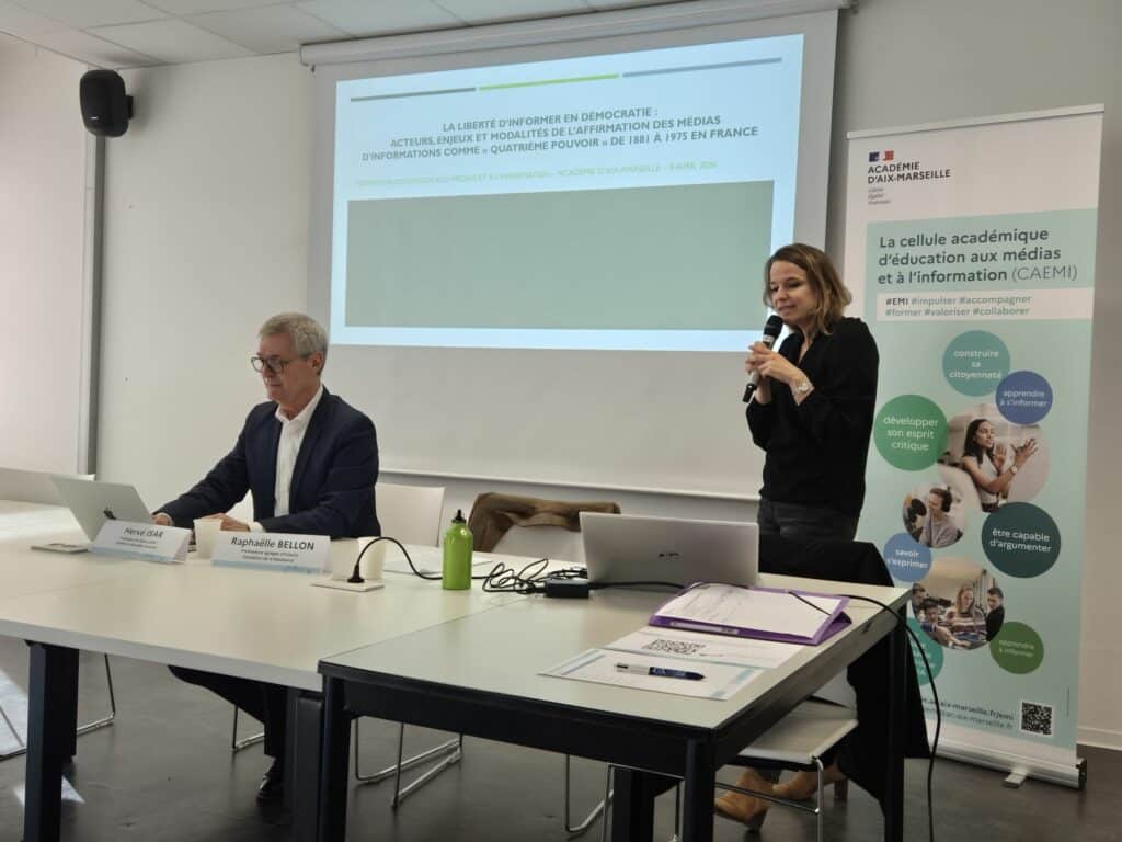 Raphaëlle Bellon, responsable des activités pédagogiques à la Fondation de la Résistance, a proposé le 6 avril 2026 à l’université d’Aix-en-Provence une conférence lors d’un séminaire dédié à l’Éducation aux médias et à l’information (EMI) pour les enseignantes et enseignantes de l’académie d’Aix-Marseille. Cette riche journée a été ouverte par Céline Borel, IA-IPR référente académique EMI, qui a organisé avec Florence Ollivier, chargée de mission sur ce sujet, ce séminaire. Après la conférence de Raphaëlle Bellon, Hervé Isar, professeur de droit à Aix-Marseille Université et membre de l’ARCOM Marseille est intervenu sur le droit des médias. Olivier Biscaye, directeur de La Provence, a présenté les actions du journal auprès de la jeunesse. L’après-midi a été consacré à des ateliers. La Fondation de la Résistance, fidèle à ses missions de transmission de l’histoire et des valeurs de la Résistance, participe activement à la formation des professeurs sur tout le territoire. Elle inscrit aussi ses activités dans les objectifs du Ministère de l’Éducation nationale, dont l’Éducation aux médias et à l’information est une priorité. Il s’agit d’un vrai enjeu de société, dans laquelle le détour par l’Histoire, et singulièrement par la Seconde Guerre mondiale et l’action de la Résistance, est porteur de sens.