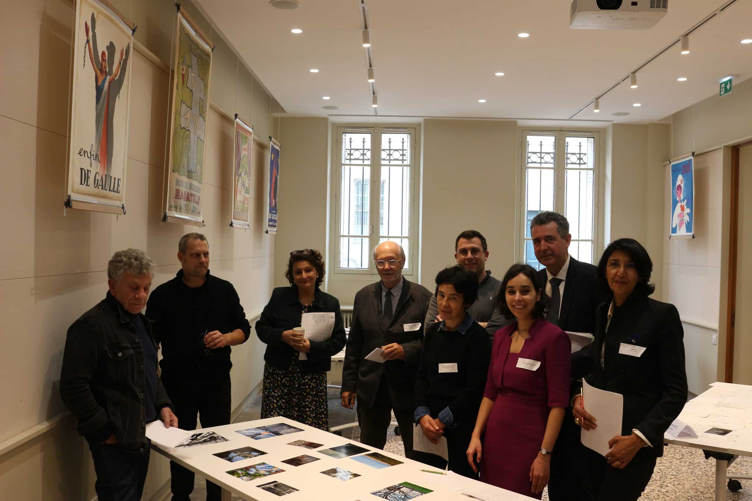 Les membres du jury présents. De gauche à droite: Patrick Chauvel (correspondant de guerre photographe), Vladimir Trouplin (musée de l’Ordre de la Libération), Joëlle Alazard (présidente de l’APHG), François-Xavier Mattéoli (président de l’Association des Amis de la Fondation de la Résistance), Catherine Dupuy (DMCA), Jérôme Maubec (Fondation de la France Libre), Sophie Junien-Lavillauroy (Fondation Charles de Gaulle), Frantz Malassis (Fondation de la Résistance) et Malika Boulahis (Office national des combattants et des victimes de guerre).