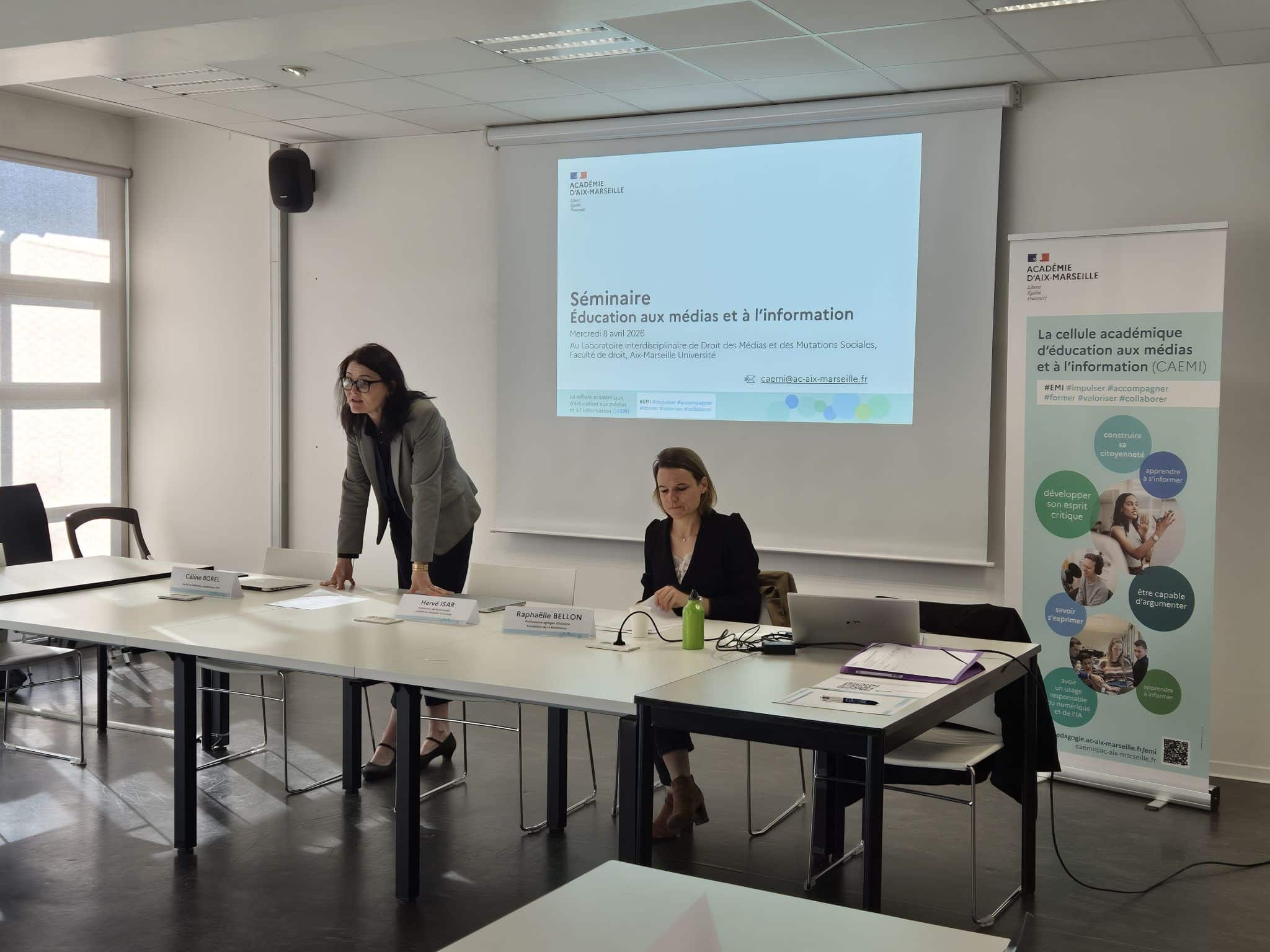 Cette riche journée a été ouverte par Céline Borel, IA-IPR référente académique EMI, qui a organisé avec Florence Ollivier, chargée de mission sur ce sujet, ce séminaire. Après la conférence de Raphaëlle Bellon, Hervé Isar, professeur de droit à Aix-Marseille Université et membre de l’ARCOM Marseille est intervenu sur le droit des médias. Olivier Biscaye, directeur de La Provence, a présenté les actions du journal auprès de la jeunesse. L’après-midi a été consacré à des ateliers.